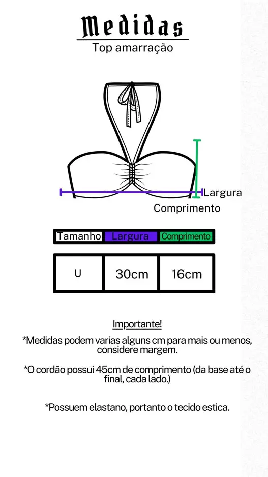 Os tops amarração são uma peça coringa no guarda roupa: combinam com tudo. São confeccionados em tecido premium, 98% algodão 2% elastano. Elas se esticam, ou seja, se adaptam a todos os biotipos. NÃO possuem poliéster, portanto sua modelagem e caimento fazem com que se tornem uma das melhores peças do mercado. Além de tudo, possuem costura reforçada nos principais pontos, garantindo aquele acabamento Co Buka que vocês já conhecem!